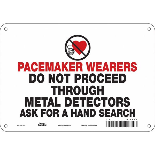 Safety Sign, 7 in Height, 10 in Width, Aluminum, Vertical Rectangle, English, 478X92SKU G5859703Categories SafetyDescription Safety Sign, Vertical Rectangle, Number of Printed Sides 1, English, Sign Format Other Format, Sign Legend Pacemaker Wearers Do Not Proceed Through Metal Detectors Ask For A Hand Search, Sign Legend Background Color White, Sign Legend Style Symbol and TextgraingerSKU: 478X92, mscSKU: , zoro_no: G5859703, mongo_id: 65bbee06526e052139ae494d