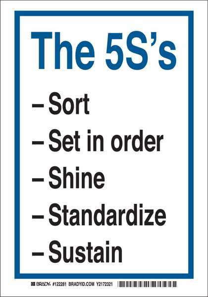 SKU G8474553Categories SafetyDescription Safety Reminder Sign, Sign Subject Matter Facility, Height 10 In., Width 7 In., Sign Material Polyester, Sign Mounting Style Adhesive Surface, Header The 5S'S, Legend The 5S's Sort -Set In Order -Shine -Standardize -Sustain, Printed Language English, Sign Shape Rectangle$16.24 / eachWeb priceSafety Reminder Sign, 10"X7", Polyester, Height: 10", 122281SKU G8474553Categories SafetyDescription Safety Reminder Sign, Sign Subject Matter Facility, Height 10 In., Width 7 In., Sign Material Polyester, Sign Mounting Style Adhesive Surface, Header The 5S'S, Legend The 5S's Sort -Set In Order -Shine -Standardize -Sustain, Printed Language English, Sign Shape Rectangle$16.24 / eachWeb price -