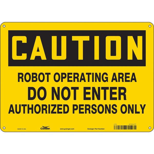 $25.19 / eachWeb priceSafety Sign, 10 in Height, 14 in Width, Aluminum, Horizontal Rectangle, English, 472L17SKU G5209403Categories SafetyDescription Safety Sign, Horizontal Rectangle, Number of Printed Sides 1, English, Sign Format Traditional OSHA, Sign Legend Robot Operating Area Do Not Enter Authorized Persons Only, Sign Legend Background Color Yellow, Sign Legend Style TextgraingerSKU: 472L17, mscSKU: , zoro_no: G5209403, mongo_id: 65bbe83422d7a989a98dfa4b