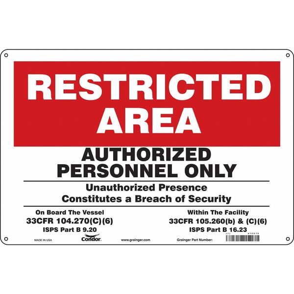 Safety Sign, 18" W, 12" H, 0.032" ThicknessSKU G5813969Categories SafetyDescription Safety Sign, Horizontal Rectangle, Number of Printed Sides 1, English, Sign Format Other Format, Sign Legend Authorized Personnel Only Unauthorized Presence Constitutes A Breach Of Security On Board Vessel 33Cfr 104.270(C)(6) ISPS Part B 9.20 Within The Facility 33Cfr 105.260(B)&(C)(6) ISPS Part B 15.23, Sign Legend Background Color Red, White, Sign Legend Style TextgraingerSKU: 472X76, mscSKU: , zoro_no: G5813969, mongo_id: 65bbea5222d7a989a99a8863