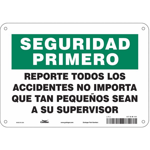 Safety Sign, 10" W, 7" H, 0.032" ThicknessSKU G5650080Categories SafetyDescription Safety Sign, Vertical Rectangle, Number of Printed Sides 1, Spanish, Sign Format Traditional OSHA, Sign Legend Reporte Todos Los Accidentes No Importa Que Tan Pequenos Sean A Su Supervisor, Sign Legend Background Color White, Sign Legend Style TextgraingerSKU: 475H18, mscSKU: , zoro_no: G5650080, mongo_id: 65bbea5222d7a989a99a8772