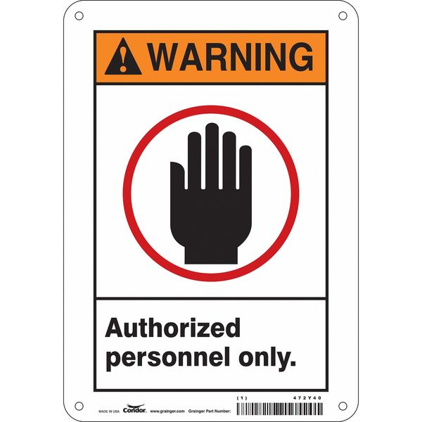 Safety Sign, 10 in Height, 7 in Width, Aluminum, Horizontal Rectangle, English, 472Y40SKU G5220262Categories SafetyDescription Safety Sign, Horizontal Rectangle, Number of Printed Sides 1, English, Sign Format Traditional OSHA, Sign Legend Authorized Personnel Only., Sign Legend Background Color White, Sign Legend Style Symbol and TextgraingerSKU: 472Y40, mscSKU: , zoro_no: G5220262, mongo_id: 65bbea5222d7a989a99a8708