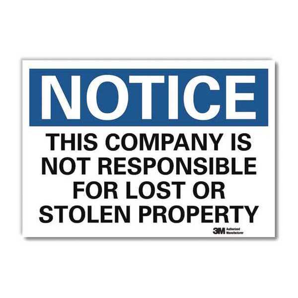Notice Sign, 5 in H, 7 in W, Reflective Sheeting, Horizontal Rectangle, English, U5-1549-RD_7X5SKU G2757091Categories SafetyDescription Notice Sign, Horizontal Rectangle, Number of Printed Sides 1, English, Sign Legend This Company Is Not Responsible For Lost Or Stolen Property, Sign Legend Background Color White, Sign Legend Style TextgraingerSKU: 34JX67, mscSKU: , zoro_no: G2757091, mongo_id: 65bbee24526e052139af2acb