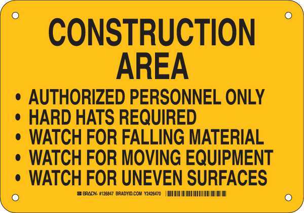 SKU G7435948Categories SafetyDescription Construction Site Sign, Sign Subject Matter Construction, Height 7 in, Width 10 in, Sign Material Plastic, Sign Mounting Style With Mounting Holes, Header Construction Area, Legend Construction Area Authorized Personnel Only Hard Hats Required Watch For Falling Material Watch For Moving Equipment Watch For Uneven Surfaces, Printed Language English, Sign Shape Rectangle$12.94 / eachWeb priceConstruction Site Sign, 7 in Height, 10 in Width, Plastic, Rectangle, EnglishSKU G7435948Categories SafetyDescription Construction Site Sign, Sign Subject Matter Construction, Height 7 in, Width 10 in, Sign Material Plastic, Sign Mounting Style With Mounting Holes, Header Construction Area, Legend Construction Area Authorized Personnel Only Hard Hats Required Watch For Falling Material Watch For Moving Equipment Watch For Uneven Surfaces, Printed Language English, Sign Shape Rectangle$12.94 / eachWeb price -