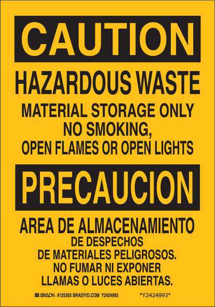 SKU G8486200Categories SafetyDescription No Smoking Sign, Sign Subject Matter Chemical, Gas or Hazardous Materials, Height 10 in, Width 7 in, Sign Material Plastic, Header Caution/Precaucion, Legend Hazardous Waste Material Storage Only No Smoking, Open Flames Or Open Lights/Area De Almacenamiento De Desechos De Materiales Peligrosos. No Fumar Ni Exponer Llamas O Luces Abiertas., Printed Language English, Spanish, Sign Shape Rectangle$11.94 / eachWeb priceNo Smoking Sign, 10" H, 7 in W, Plastic, Rectangle, English, Spanish, 125392SKU G8486200Categories SafetyDescription No Smoking Sign, Sign Subject Matter Chemical, Gas or Hazardous Materials, Height 10 in, Width 7 in, Sign Material Plastic, Header Caution/Precaucion, Legend Hazardous Waste Material Storage Only No Smoking, Open Flames Or Open Lights/Area De Almacenamiento De Desechos De Materiales Peligrosos. No Fumar Ni Exponer Llamas O Luces Abiertas., Printed Language English, Spanish, Sign Shape Rectangle$11.94 / eachWeb price -
