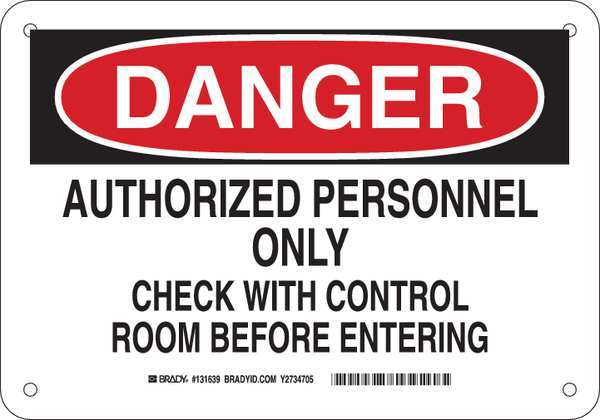 SKU G8450771Categories SafetyDescription Danger Sign, Sign Subject Matter Authorized Personnel and Restricted Access, Height 7 in, Width 10 in, Sign Material Aluminum, Sign Mounting Style With Mounting Holes, Header Danger, Legend Authorized Personnel Only Check With Control Room Before Entering, Printed Language English, Sign Shape Rectangle$18.56 / eachWeb priceDanger Sign, 7" HX10" W, AluminumSKU G8450771Categories SafetyDescription Danger Sign, Sign Subject Matter Authorized Personnel and Restricted Access, Height 7 in, Width 10 in, Sign Material Aluminum, Sign Mounting Style With Mounting Holes, Header Danger, Legend Authorized Personnel Only Check With Control Room Before Entering, Printed Language English, Sign Shape Rectangle$18.56 / eachWeb price -