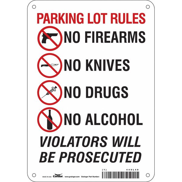 $14.74 / eachWeb priceSafety Sign, 10 in Height, 7 in Width, Aluminum, Horizontal Rectangle, English, 449L48SKU G5230178Categories SafetyDescription Safety Sign, Horizontal Rectangle, Number of Printed Sides 1, English, Sign Legend Parking Lot Rules No Firearms No Knives No Drugs No Alcohol Violators Will Be Prosecuted, Sign Legend Background Color White, Sign Legend Style Symbol and TextgraingerSKU: 449L48, mscSKU: , zoro_no: G5230178, mongo_id: 65bbe83422d7a989a98df9a5