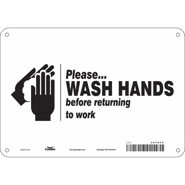 $18.74 / eachWeb priceSafety Sign, 7 in Height, 10 in Width, Aluminum, Vertical Rectangle, English, 485N40SKU G6266640Categories SafetyDescription Safety Sign, Vertical Rectangle, Number of Printed Sides 1, English, Sign Legend Please Wash Hands Before Returning To Work, Sign Legend Background Color White, Sign Legend Style Symbol and TextgraingerSKU: 485N40, mscSKU: , zoro_no: G6266640, mongo_id: 65bbe83422d7a989a98df940