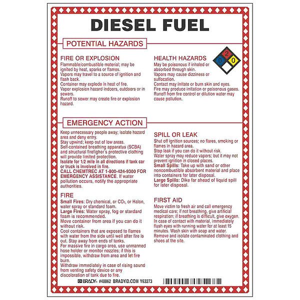 SKU G7588375Categories SafetyDescription Chemical Sign, Diesel Fuel Potential Hazards, Fiberglass, Height 10 in, Width 7 in, Header No Header, Legend Style Symbol and Text, Language English, Mounting Style Surface, Thickness 0.1 in, Sign Shape Rectangle, Operating Temp. Range -40 Degrees to 194 Degrees F, Retroreflective Grade Not RetroreflectivegraingerSKU: 41F473, mscSKU: , zoro_no: G7588375, mongo_id: 65bbea4122d7a989a99a2ba1
