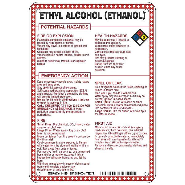 SKU G5620693Categories SafetyDescription Chemical Sign, Ethyl Alcohol (Ethanol) Potential Hazards, Fiberglass, Height 10 in, Width 7 in, Header No Header, Legend Style Symbol and Text, Language English, Mounting Style Surface, Thickness 0.1 in, Sign Shape Rectangle, Operating Temp. Range -40 Degrees to 194 Degrees F, Retroreflective Grade Not RetroreflectivegraingerSKU: 41F475, mscSKU: , zoro_no: G5620693, mongo_id: 65bbe9ec22d7a989a9986126