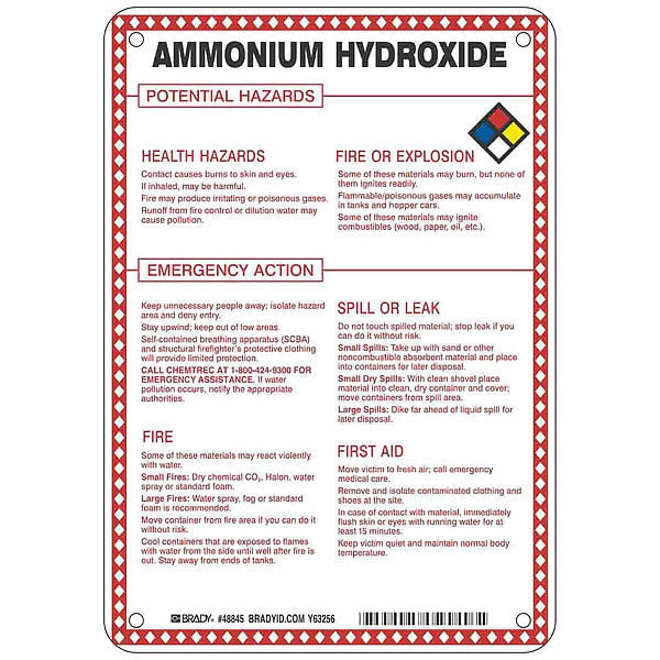 SKU G5807636Categories SafetyDescription Chemical Sign, Ammonium Hydroxide Potential Hazards, Fiberglass, Height 10 in, Width 7 in, Header No Header, Legend Style Symbol and Text, Language English, Mounting Style Surface, Thickness 0.1 in, Sign Shape Rectangle, Operating Temp. Range -40 Degrees to 194 Degrees F, Retroreflective Grade Not RetroreflectivegraingerSKU: 41F456, mscSKU: , zoro_no: G5807636, mongo_id: 65bbea4122d7a989a99a2b4b