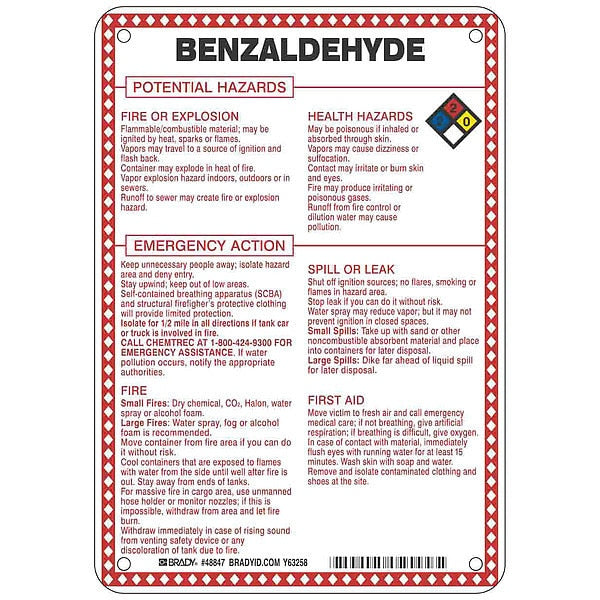 SKU G5834753Categories SafetyDescription Chemical Sign, Benzaldehyde Potential Hazards, Fiberglass, Height 10 in, Width 7 in, Header No Header, Legend Style Symbol and Text, Language English, Mounting Style Surface, Thickness 0.1 in, Sign Shape Rectangle, Operating Temp. Range -40 Degrees to 194 Degrees F, Retroreflective Grade Not RetroreflectivegraingerSKU: 41F458, mscSKU: , zoro_no: G5834753, mongo_id: 65bbe99f22d7a989a9969507