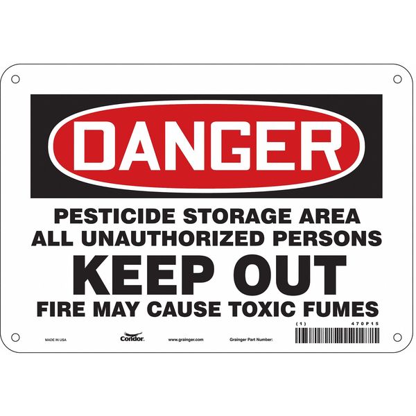 Safety Sign, 7 in Height, 10 in Width, Aluminum, Vertical Rectangle, English, 470P15SKU G5279902Categories SafetyDescription Safety Sign, Vertical Rectangle, Number of Printed Sides 1, English, Sign Format Traditional OSHA, Sign Legend Pesticide Storage Area All Unauthorized Persons Keep Out Fire May Cause Toxic Fumes, Sign Legend Background Color White, Sign Legend Style TextgraingerSKU: 470P15, mscSKU: , zoro_no: G5279902, mongo_id: 65bbe9fd22d7a989a998bdf4