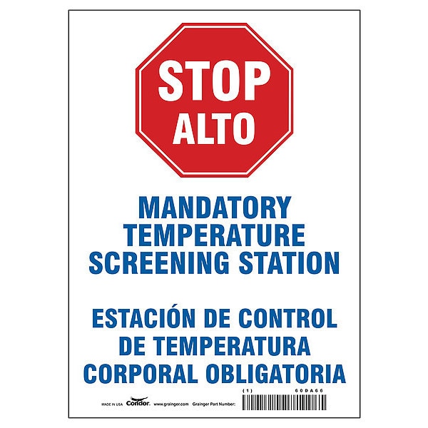 SKU G8447942Categories SafetyDescription Bilingual Temperature Screening Sign, Sign Subject Matter Coronavirus Prevention, Height 14 in, Width 10 in, Sign Material Aluminum, Sign Mounting Style With Mounting Holes, Header No Header, Legend Stop Alto Mandatory Temperature Screening Station Estación De Control De Temperatura Corporal Obligatoria, Printed Language English, Spanish, Sign Shape RectanglegraingerSKU: , mscSKU: , zoro_no: G8447942, mongo_id: 65bbe9fd22d7a989a998be15