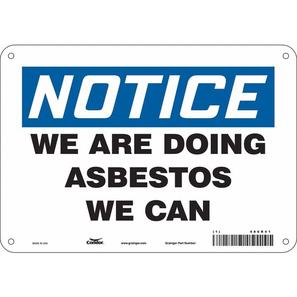 Safety Sign, 7 in Height, 10 in Width, Aluminum, Vertical Rectangle, English, 486R41SKU G6257087Categories SafetyDescription Safety Sign, Vertical Rectangle, Number of Printed Sides 1, English, Sign Legend We Are Doing Asbestos We Can, Sign Legend Background Color White, Sign Legend Style TextgraingerSKU: 486R41, mscSKU: , zoro_no: G6257087, mongo_id: 65bbe9fd22d7a989a998bd7c