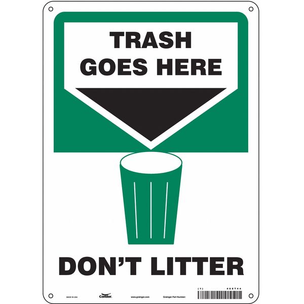 Safety Sign, 14 in Height, 10 in Width, Aluminum, Vertical Rectangle, English, 468T44SKU G5602873Categories SafetyDescription Safety Sign, Vertical Rectangle, Number of Printed Sides 1, English, Sign Legend Trash Goes Here Don't Litter, Sign Legend Background Color Green, White, Sign Legend Style Symbol and TextgraingerSKU: 468T44, mscSKU: , zoro_no: G5602873, mongo_id: 65bbe9fd22d7a989a998bc71