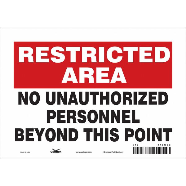 SKU G5501017Categories SafetyDescription Safety Sign, Vertical Rectangle, Number of Printed Sides 1, English, Sign Format Other Format, Sign Legend No Unauthorized Personnel Beyond This Point, Sign Legend Background Color Red, White, Sign Legend Style TextgraingerSKU: 472W92, mscSKU: , zoro_no: G5501017, mongo_id: 65bbe9fd22d7a989a998bd20