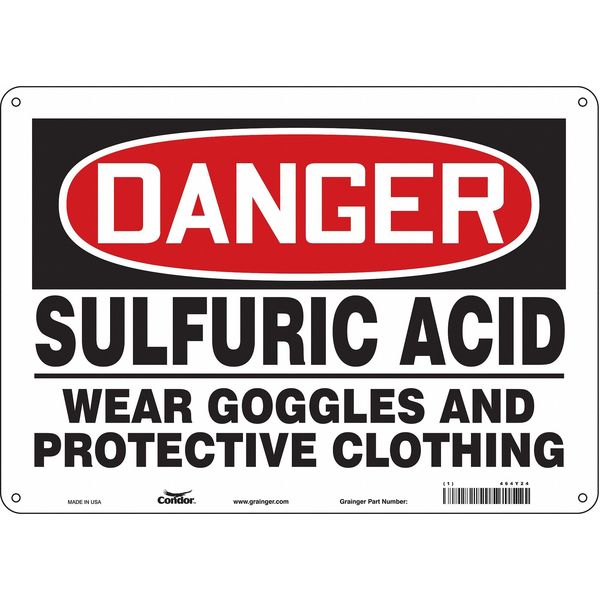 Safety Sign, 10 in Height, 14 in Width, Aluminum, Horizontal Rectangle, English, 464Y24SKU G5084182Categories SafetyDescription Safety Sign, Horizontal Rectangle, Number of Printed Sides 1, English, Sign Format Traditional OSHA, Sign Legend Sulfuric Acid Wear Goggles And Protective Clothing, Sign Legend Background Color White, Sign Legend Style TextgraingerSKU: 464Y24, mscSKU: , zoro_no: G5084182, mongo_id: 65bbe9d322d7a989a997d8b0