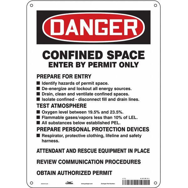 SKU G5183479Categories SafetyDescription Safety Sign, Vertical Rectangle, Number of Printed Sides 1, English, Sign Format Traditional OSHA, Sign Legend Confined Space Enter By Permit Only Prepare For Entry Test Atmosphere Prepare Personal Protection Devices Attendant And Rescue Equipment In Place Review Communication Procedures Obtain Authorized Permit, Sign Legend Background Color White, Sign Legend Style TextgraingerSKU: 465K51, mscSKU: , zoro_no: G5183479, mongo_id: 65bbe9d322d7a989a997d85f