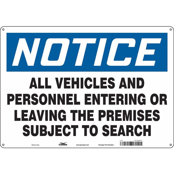 SKU G5794028Categories SafetyDescription Safety Sign, Horizontal Rectangle, Number of Printed Sides 1, English, Sign Legend All Vehicles And Personnel Entering Or Leaving The Premises Subject To Search, Sign Legend Background Color White, Sign Legend Style TextgraingerSKU: 472D61, mscSKU: , zoro_no: G5794028, mongo_id: 65bbe9d322d7a989a997d8be
