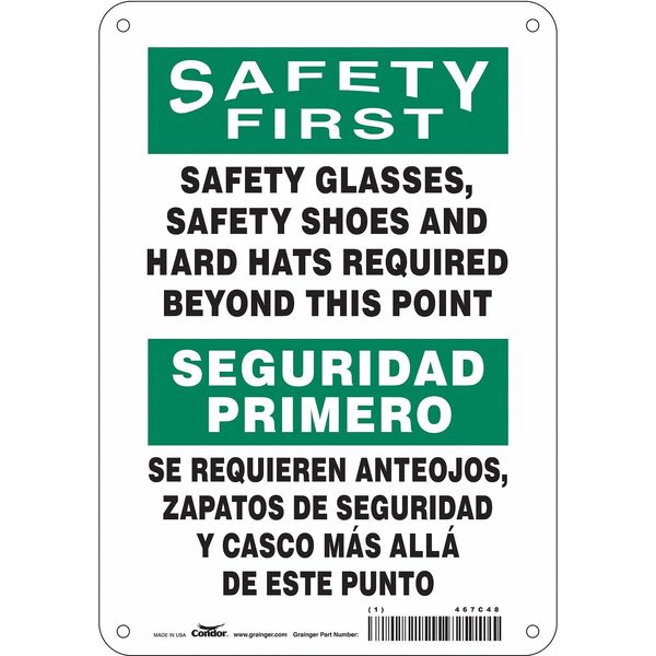 Safety Sign, 10 in Height, 7 in Width, Aluminum, Horizontal Rectangle, English, Spanish, 467C48SKU G5848987Categories SafetyDescription Safety Sign, Horizontal Rectangle, Number of Printed Sides 1, English, Spanish, Sign Format Traditional OSHA, Sign Legend Safety Glasses, Safety Shoes And Hard Hats Required Beyond This Point/Se Requieren Anteojos, Zapatos De Sequirdad Y Casco Mas Alla De Este Punto, Zapatos De Sequirdad Y Casco Mas Alla De Este Punto, Sign Legend Background Color White, Sign Legend Style TextgraingerSKU: 467C48, mscSKU: , zoro_no: G5848987, mongo_id: 65bbe9d322d7a989a997d684