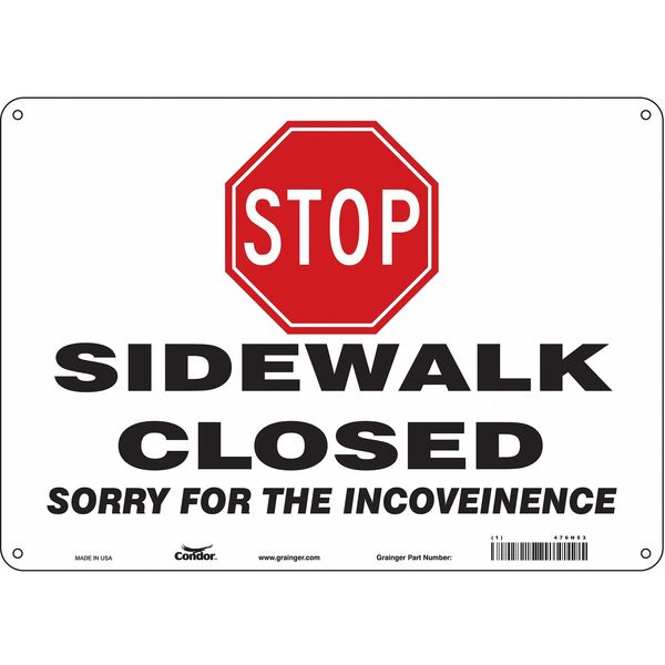 Safety Sign, 10 in Height, 14 in Width, Aluminum, Horizontal Rectangle, English, 476H53SKU G5845618Categories SafetyDescription Safety Sign, Horizontal Rectangle, Number of Printed Sides 1, English, Sign Format Other Format, Sign Legend Stop Sidewalk Closed Sorry For The Inconvenience, Sign Legend Background Color Red, White, Sign Legend Style Symbol and TextgraingerSKU: 476H53, mscSKU: , zoro_no: G5845618, mongo_id: 65bbe9d322d7a989a997d7ad