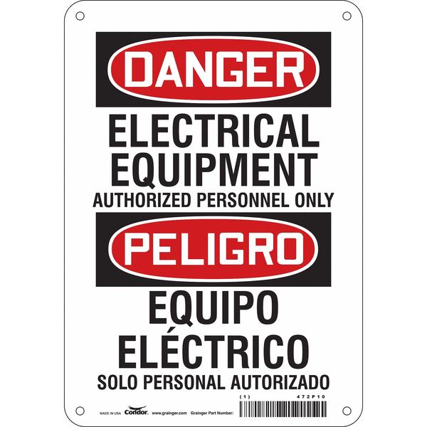 Safety Sign, 10 in Height, 7 in Width, Aluminum, Horizontal Rectangle, English, Spanish, 472P10SKU G5834899Categories SafetyDescription Safety Sign, Horizontal Rectangle, Number of Printed Sides 1, English, Spanish, Sign Format Traditional OSHA, Sign Legend Electrical Equipment Authorized Personnel Only/Equipo Electrico Solo Personal Autorizado, Sign Legend Background Color White, Sign Legend Style TextgraingerSKU: 472P10, mscSKU: , zoro_no: G5834899, mongo_id: 65bbe9d322d7a989a997d760