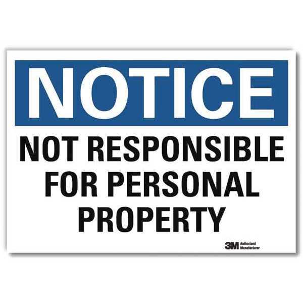Notice Sign, 10 in H, 14 in W, Reflective Sheeting, Horizontal Rectangle, English, U5-1432-RD_14X10SKU G2759130Categories SafetyDescription Notice Sign, Horizontal Rectangle, Number of Printed Sides 1, English, Sign Format Traditional OSHA, Sign Legend Not Responsible For Personal Property, Sign Legend Background Color White, Sign Legend Style TextgraingerSKU: 34JU58, mscSKU: , zoro_no: G2759130, mongo_id: 65bbe9d322d7a989a997d409