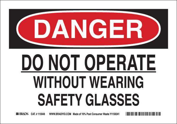 Danger Sign, 10"Hx14"W, Eco-Frndly Plstc, Legend: Do Not Operate Without Wearing Safety Glasses