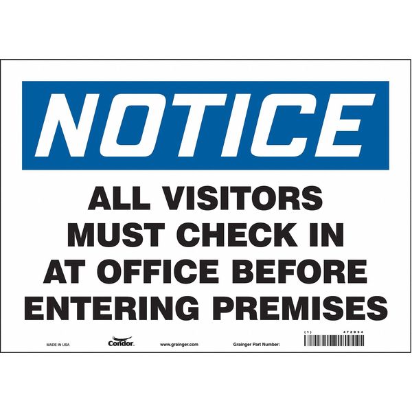 Safety Sign, 10 in Height, 14 in Width, Vinyl, Horizontal Rectangle, English, 472D94SKU G5059262Categories SafetyDescription Safety Sign, Horizontal Rectangle, Number of Printed Sides 1, English, Sign Legend All Visitors Must Check In At Office Before Entering Premises, Sign Legend Background Color White, Sign Legend Style TextgraingerSKU: 472D94, mscSKU: , zoro_no: G5059262, mongo_id: 65bbe9fd22d7a989a998bba5