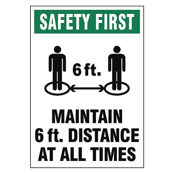SKU G6675244Categories Adhesives, Epoxy & Sealants , SafetyDescription Adhesive Safety Sign, Sign Subject Matter Social Distancing, Height 10 in, Width 7 in, Sign Material Vinyl, Sign Mounting Style Adhesive Surface, Header Safety First, Legend Maintain 6 Ft. Distance At All Times, Printed Language EnglishgraingerSKU: , mscSKU: , zoro_no: G6675244, mongo_id: 65bbe9fd22d7a989a998b66c