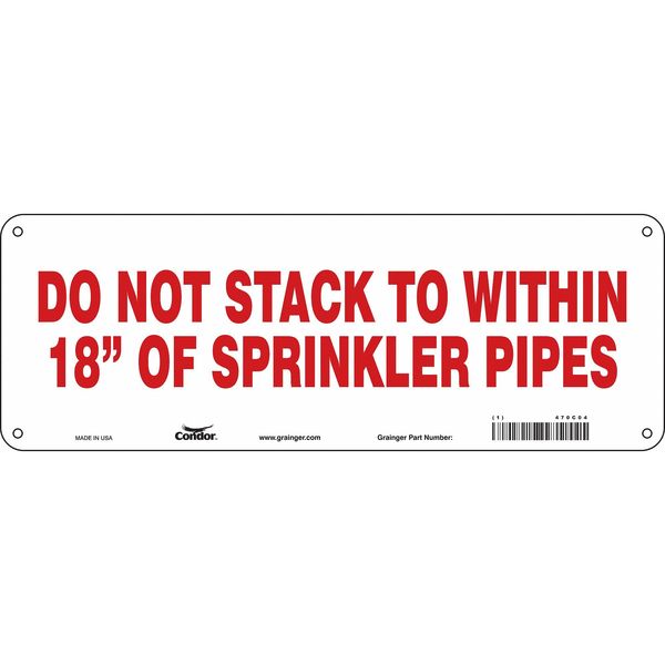 Safety Sign, 5 in Height, 14 in Width, Aluminum, Vertical Rectangle, EnglishSKU G5570317Categories SafetyDescription Safety Sign, Vertical Rectangle, Number of Printed Sides 1, English, Sign Format Other Format, Sign Legend Do Not Stack To Within 18 In. Of Sprinkler Pipes, Sign Legend Background Color White, Sign Legend Style TextgraingerSKU: 470C04, mscSKU: , zoro_no: G5570317, mongo_id: 65bbea2822d7a989a999a10f