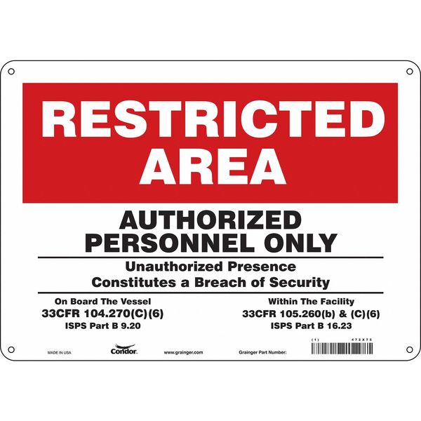 Safety Sign, 10 in Height, 14 in Width, Aluminum, Horizontal Rectangle, English, 472X75SKU G5778442Categories SafetyDescription Safety Sign, Horizontal Rectangle, Number of Printed Sides 1, English, Sign Format Other Format, Sign Legend Authorized Personnel Only Unauthorized Presence Constitutes A Breach Of Security On Board Vessel 33Cfr 104.270(C)(6) ISPS Part B 9.20 Within The Facility 33Cfr 105.260(B)&(C)(6) ISPS Part B 15.23, Sign Legend Background Color Red, White, Sign Legend Style TextgraingerSKU: 472X75, mscSKU: , zoro_no: G5778442, mongo_id: 65bbea2822d7a989a999a321