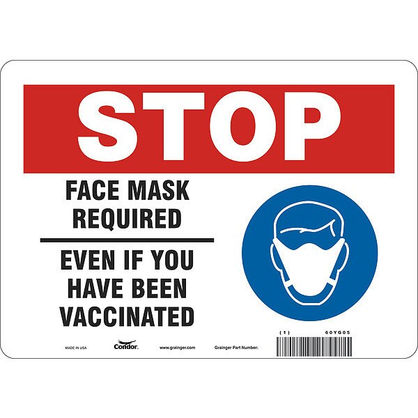 SKU G400460944Categories SafetyDescription Facemask Reminder Safety Sign, Height 10 in, Width 14 in, Sign Material Aluminum, Header Stop, Legend Face Mask Required Even If You Have Been Vaccinated, Printed Language EnglishgraingerSKU: , mscSKU: , zoro_no: G400460944, mongo_id: 65bbea2822d7a989a999a231