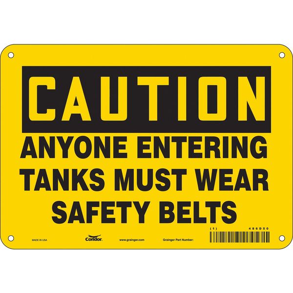 $18.74 / eachWeb priceSafety Sign, 7 in Height, 10 in Width, Aluminum, Vertical Rectangle, English, 486D50SKU G6267401Categories SafetyDescription Safety Sign, Vertical Rectangle, Number of Printed Sides 1, English, Sign Format Traditional OSHA, Sign Legend Anyone Entering Tanks Must Wear Safety Belts, Sign Legend Background Color Yellow, Sign Legend Style TextgraingerSKU: 486D50, mscSKU: , zoro_no: G6267401, mongo_id: 65bbe83422d7a989a98df957