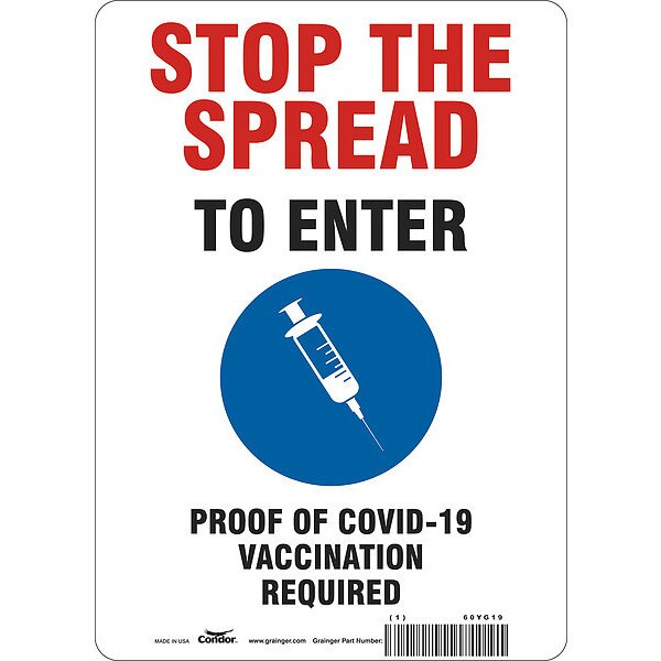 Employee/Visitor Vaccine Proof Sign, 60YG19SKU G100460930Categories SafetyDescription Employee/Visitor Vaccine Proof Sign, Height 14 in, Width 10 in, Sign Material Vinyl, Header Stop The Spread, Legend To Enter Proof Of COVID-19 Vaccination Required, Printed Language EnglishgraingerSKU: , mscSKU: , zoro_no: G100460930, mongo_id: 65bbea2822d7a989a999a117