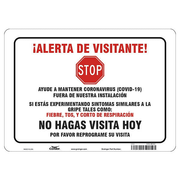 Covid 19 Sign 10X14, Spanish Visitor Ale, 10 in Height, 14 in Width, Aluminum, SpanishSKU G7660652Categories SafetyDescription Covid 19 Sign 10X14, Spanish Visitor Ale, Sign Subject Matter Coronavirus Prevention, Height 10 in, Width 14 in, Sign Material Aluminum, Sign Mounting Style With Mounting Holes, Header No Header, Legend ¡Alerta De Visitante! Stop; Ayude A Mantener Coronavirus (Covid-19) Fuera De Nuestra Instalación; Si Estás Experimentando Sintomas Similares A La Gripe Tales Como Fiebrea, Tos Y Corta De Respiración; No Haga Visita Hoy; Por Favor Reprograme Su Visita, Printed Language SpanishgraingerSKU: , mscSKU: , zoro_no: G7660652, mongo_id: 65bbea2822d7a989a999a23f