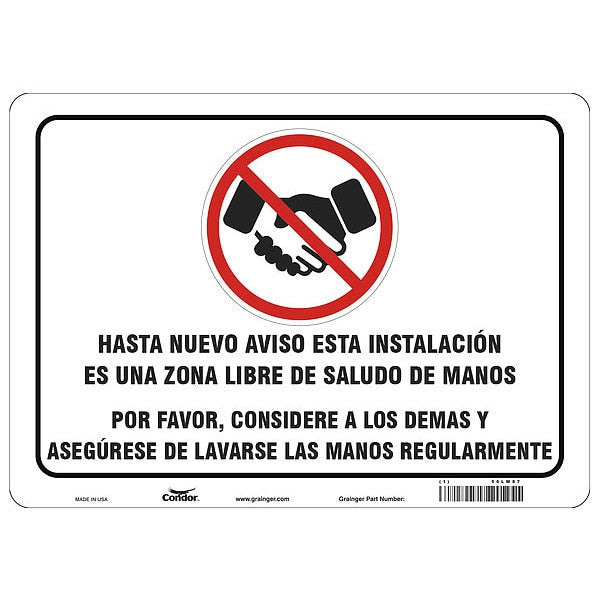 SKU G7661176Categories SafetyDescription Covid 19 Sign 10X14, Spanish Handshake F, Sign Subject Matter Coronavirus Prevention, Height 10 in, Width 14 in, Sign Material Polystyrene, Sign Mounting Style With Mounting Holes, Header No Header, Legend Hasta Nuevo Aviso Esta Instalación Es Una Zona Libre De Saludo De Manos; Por Favor, Considere A Los Demas Y Asegúrese De Lavarse Las Manos Regularmente, Printed Language SpanishgraingerSKU: , mscSKU: , zoro_no: G7661176, mongo_id: 65bbea2822d7a989a999a2d6