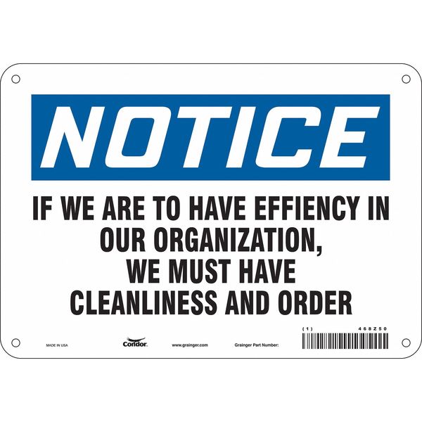 SKU G5167631Categories SafetyDescription Safety Sign, Vertical Rectangle, Number of Printed Sides 1, English, Sign Format Traditional OSHA, Sign Legend If We Are To Have Efficiency In Our Organization, We Must Have Cleanliness And Order, Sign Legend Background Color White, Sign Legend Style TextgraingerSKU: 468Z50, mscSKU: , zoro_no: G5167631, mongo_id: 65bbea2822d7a989a999a1d0