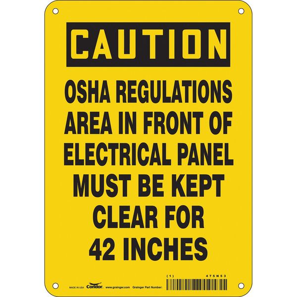 Safety Sign, 10 in Height, 7 in Width, Aluminum, Horizontal Rectangle, English, 475N53SKU G5626947Categories SafetyDescription Safety Sign, Horizontal Rectangle, Number of Printed Sides 1, English, Sign Format Traditional OSHA, Sign Legend Osha Regulations Area In Front Of Electrical Panel Must Be Kept Clear For 42 Inches, Sign Legend Background Color Yellow, Sign Legend Style TextgraingerSKU: 475N53, mscSKU: , zoro_no: G5626947, mongo_id: 65bbea2822d7a989a999a12b