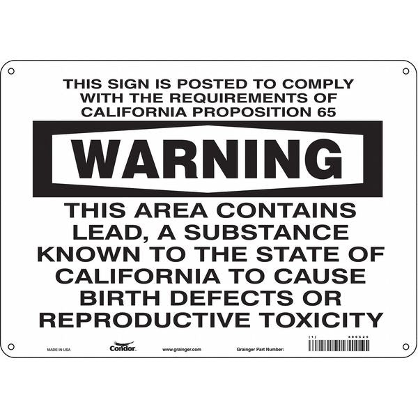 Chemical Sign, 10 in H, 14 in W, Horizontal Rectangle, English, 486C25SKU G6269090Categories SafetyDescription Chemical Sign, Horizontal Rectangle, Number of Printed Sides 1, English, Sign Format Other Format, Sign Legend This Sign Is Posted To Comply With The Requirements Of California Proposition 65 This Area Contains Lead, A Substance Known To The State Of California To Cause Birth Defects Or Reproductive Toxicity, Sign Legend Background Color White, Sign Legend Style TextgraingerSKU: 486C25, mscSKU: , zoro_no: G6269090, mongo_id: 65bbea2822d7a989a999a214