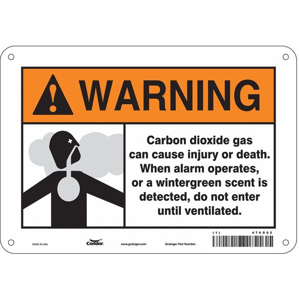 Chemical Sign, 7 in H, 10 in W, Vertical Rectangle, English, 476G02SKU G5831073Categories SafetyDescription Chemical Sign, Vertical Rectangle, Number of Printed Sides 1, English, Sign Format ANSI/OSHA Format, Sign Legend Carbon Dioxide Gas Can Cause Injury Or Death. When Alarm Operates, Or A Wintergreen Scent Is Detected, Do Not Enter Until Ventilated., Sign Legend Background Color White, Sign Legend Style Symbol and TextgraingerSKU: 476G02, mscSKU: , zoro_no: G5831073, mongo_id: 65bbe9ad22d7a989a996f355