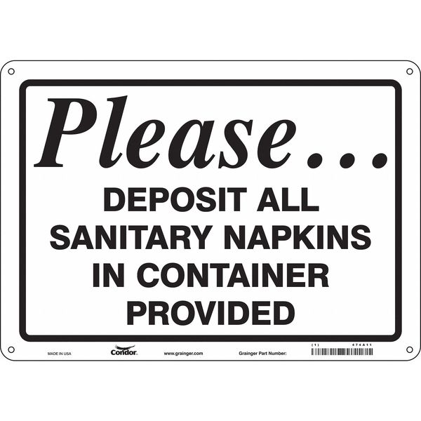 Restroom Sign, 14" W, 10" H, 0.032" Thick, 474A11SKU G5635417Categories SafetyDescription Restroom Sign, Horizontal Rectangle, Number of Printed Sides 1, English, Sign Format Other Format, Sign Legend Please...Deposit All Sanitary Napkins In Container Provided, Sign Legend Background Color White, Sign Legend Style TextgraingerSKU: 474A11, mscSKU: , zoro_no: G5635417, mongo_id: 65bbe9ad22d7a989a996f2a1