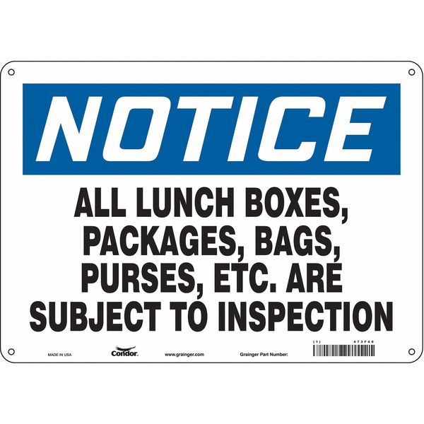 SKU G5650543Categories SafetyDescription Safety Sign, Horizontal Rectangle, Number of Printed Sides 1, English, Sign Legend All Lunch Boxes, Packages, Bags, Purses, Etc. Are Subject To Inspection, Sign Legend Background Color White, Sign Legend Style TextgraingerSKU: 473F40, mscSKU: , zoro_no: G5650543, mongo_id: 65bbe9ad22d7a989a996f2ca