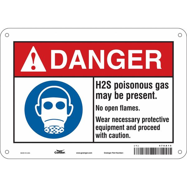 Chemical Sign, 10"W, 7" H, 0.032" Thickness, 476A15SKU G5854602Categories SafetyDescription Chemical Sign, Vertical Rectangle, Number of Printed Sides 1, English, Sign Format ANSI/OSHA Format, Sign Legend H2S Poisonous Gas May Be Present. No Open Flames. Wear Necessary Protective Equipment And Proceed With Caution., Sign Legend Background Color White, Sign Legend Style Symbol and TextgraingerSKU: 476A15, mscSKU: , zoro_no: G5854602, mongo_id: 65bbe9ad22d7a989a996f326