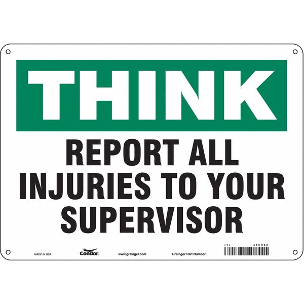 SKU G5897223Categories SafetyDescription Safety Sign, Horizontal Rectangle, Number of Printed Sides 1, English, Sign Format Other Format, Sign Legend Report All Injuries To Your Supervisor, Sign Legend Background Color Green, White, Sign Legend Style TextgraingerSKU: 475H92, mscSKU: , zoro_no: G5897223, mongo_id: 65bbe98822d7a989a9960bc4
