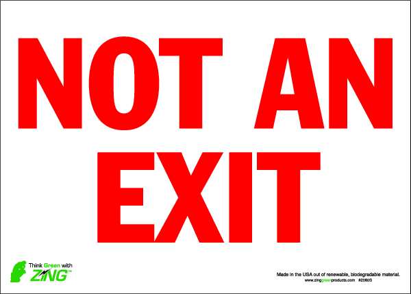 Sign, Not An EXit, 10X14", AdhesiveSKU G8437322Categories Adhesives, Epoxy & Sealants , SafetyDescription Exit Sign, Sign Subject Matter Exit and Entrance, Height 10 In., Width 14 In., Sign Material Polyester, Sign Mounting Style Adhesive Surface, Legend Not An Exit, Printed Language English, Sign Shape RectanglegraingerSKU: , mscSKU: , zoro_no: G8437322, mongo_id: 65bbe98822d7a989a996082f