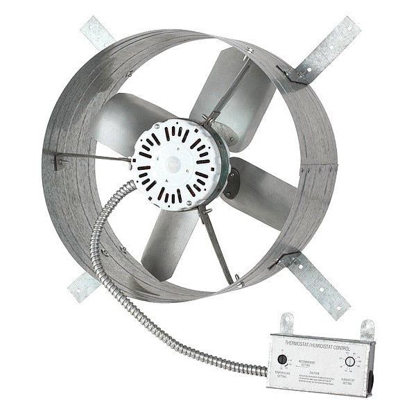 SKU G3947867CategoriesDescription Attic Exhaust Fan, Control Type Humidistat, Thermostat, Blade Material Steel, Exhaust Airflow @ 0.000 in SP 1,650 cfm, Fire Safety Shut-Off No, High-Efficiency Motor No, Housing Material Steel, Includes Humidistat Yes, Includes Shutter No, Includes Thermostat Yes, Maximum Attic Area 2,300 sq ft, Motor Horsepower 1/8 hp, Mounting Location Gable, Nameplate Voltage 120V AC, Overall Diameter 15 in, Overall Height 8 in, Overall Length 15 in, Overall Width 15 in, Dome Shape Not ApplicablegraingerSKU: , mscSKU: , zoro_no: G3947867, mongo_id: 65bbe61d3aaddbd5a900aca4