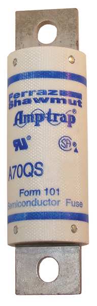 SKU G3538071CategoriesDescription Semiconductor Fuse, 90 A, 700V AC, 650V DC, A70Q Series, Nonindicating, Fast Acting, Body Style Bolt-On, Nonrejection, Interrupt Rating 100kA at 650V DC, 100kA at 700V AC, Fuse Size 4-3/8 in L x 1-1/4 in dia, Length 4 3/8 in, Diameter 1 1/4 in, Equivalent Brand and Series Bussmann FWP, Mersen A70Q, Equivalent Series A70Q, FWP, Body Material Fiberglass, Single Element, Standards CE, UL Recognized, Guide JFHR2, File E60314graingerSKU: 6XPN3, mscSKU: , zoro_no: G3538071, mongo_id: 65bbe9d322d7a989a997cfa5