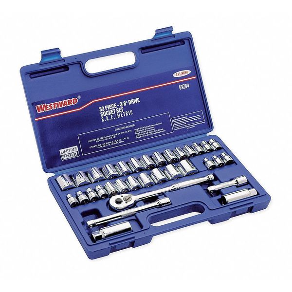 $101.24 / eachWeb price3/8" Drive Socket Wrench Set, SAE, Metric, 33 pcsSKU G1782584CategoriesDescription Socket Wrench Set, Standard Socket Count/Style (28) 12-Point, Standard Socket Style/Size Standard 12-Point:1/4 in, 5/16 in, 3/8 in, 7/16 in, 1/2 in, 9/16 in, 5/8 in, 11/16 in, 3/4 in, 13/16 in, 7/8 in, 6mm, 7mm, 8mm, 9mm, 10mm, 11mm, 12mm, 13mm, 14mm, 15mm, 16mm, 17mm, 18mm, 19mm, 20mm, 21mm, 22mm, Deep Socket Count/Style None, Flex Socket Count/Style None, Drive Size 3/8 in, Drive Type Hand, Alloy Steel, Chrome, Impact Rated NograingerSKU: 6XZ84, mscSKU: , zoro_no: G1782584, mongo_id: 65bbe7b19a749db82274ec03